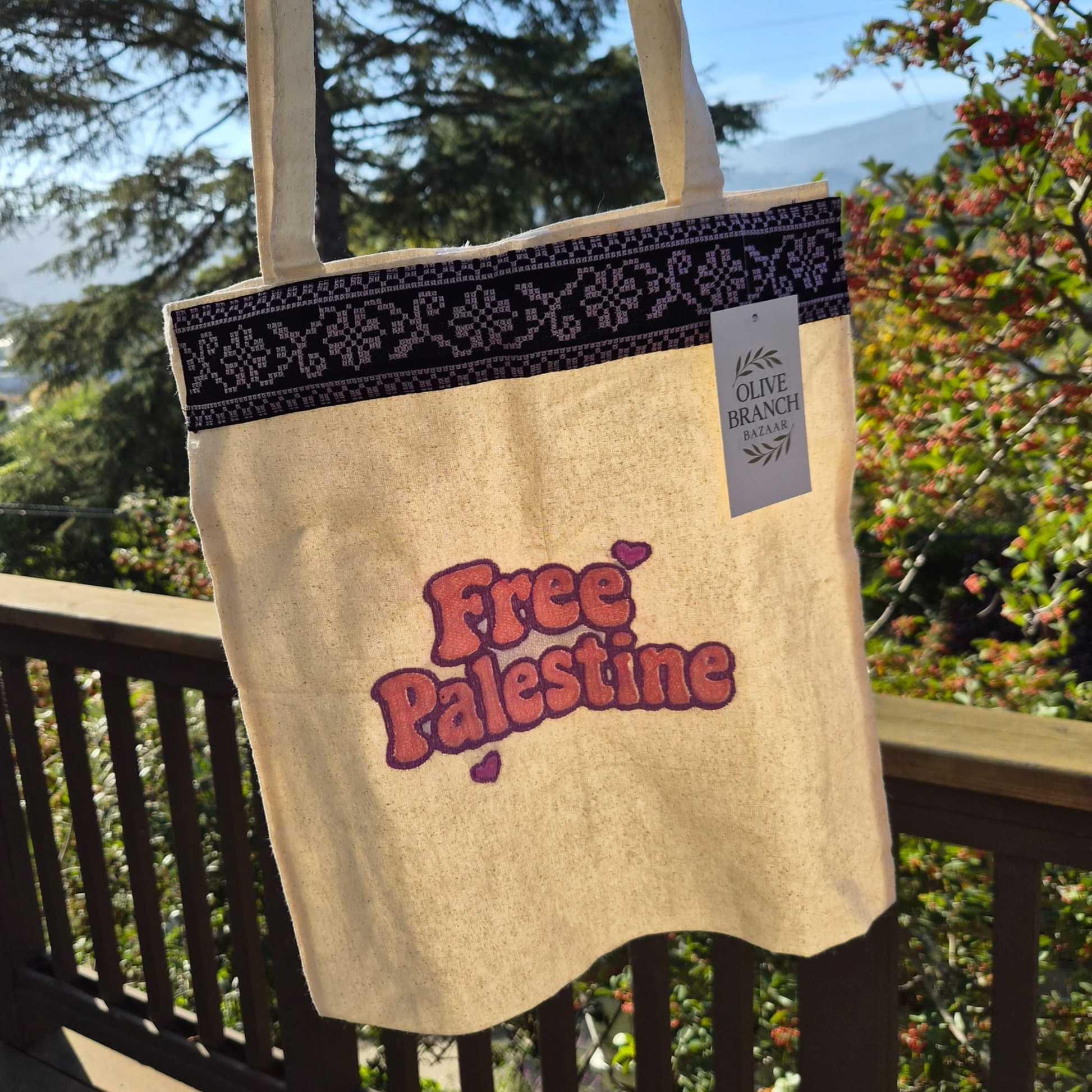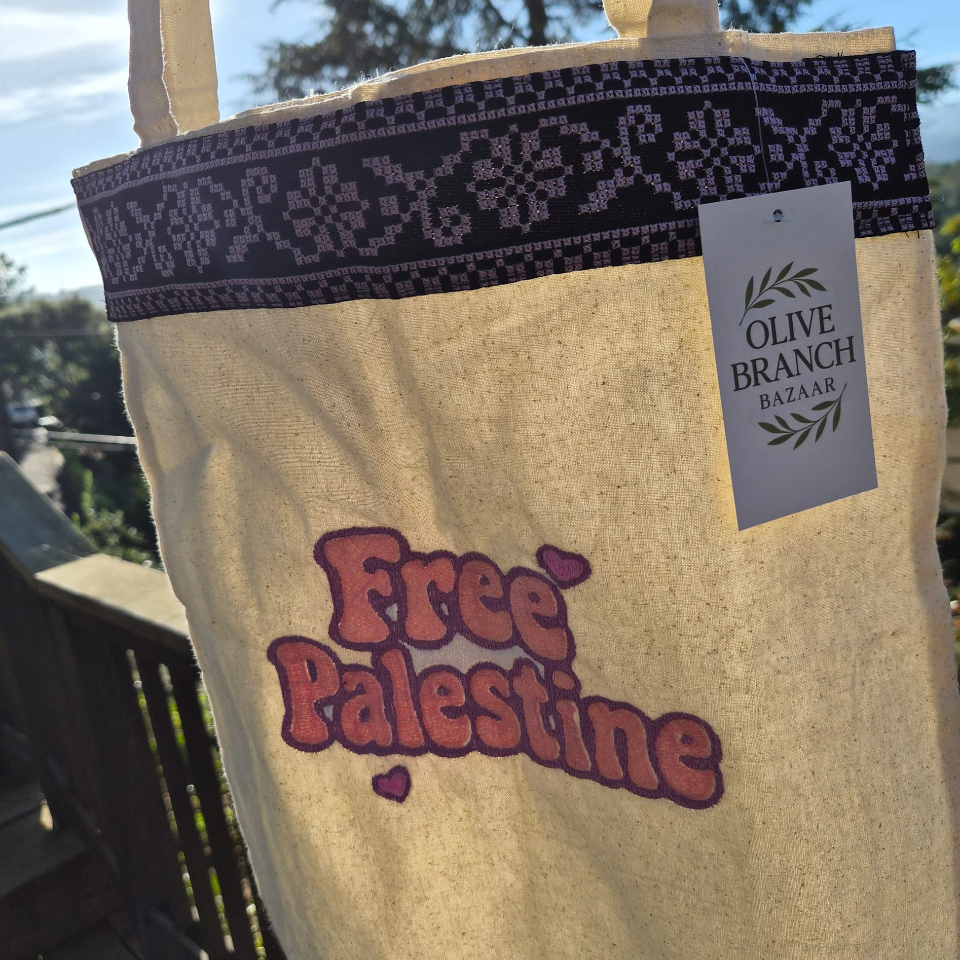 Handmade - Canvas Tote Bag - Pink and Purple Free Palestine Embroidery and Purple Tatreez