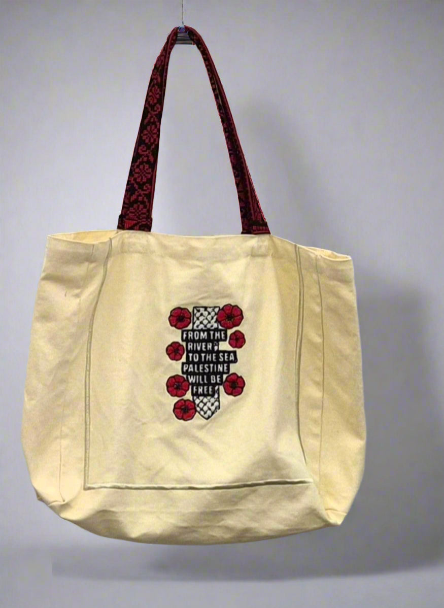 Embroidered tote bag, featuring the iconic kufiya print and bright poppy flowers alongside the inspiring phrase "From The River To The Sea, Palestine Will Be Free" and tatreez straps.