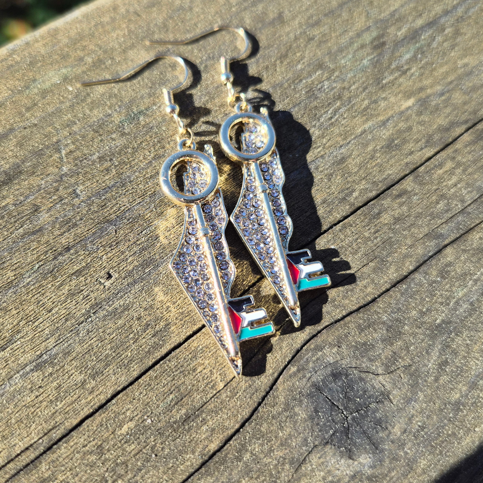 Shine bright with these Gold and Silver Rhinestone Palestine Map & Key Earrings.